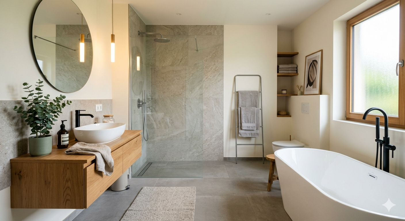 Eine der beliebtesten Bad umbauen Ideen ist die Kombination aus modernen Elementen und natürlichen Materialien. Holzoptik-Fliesen, Naturstein oder Betonoberflächen verleihen dem Badezimmer eine warme und gleichzeitig moderne Atmosphäre. Besonders im Trend liegen aktuell Spa-inspirierte Bäder mit Regenduschen, freistehenden Badewannen und indirekter Beleuchtung. Pflanzen können ebenfalls integriert werden und sorgen für ein frisches Raumklima.